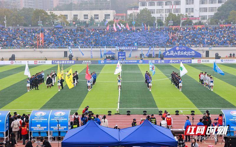 开幕式在融合音、舞、体元素的非遗秀等文艺表演中拉开序幕。随后,内蒙古呼和浩特队、山东泰安队、黑龙江哈尔滨队、广东湛江队、青海玉树队以及东道主“湘超”冠军湖南永州队六支参赛队伍挥舞各自的战旗一一亮相,齐聚绿茵场。