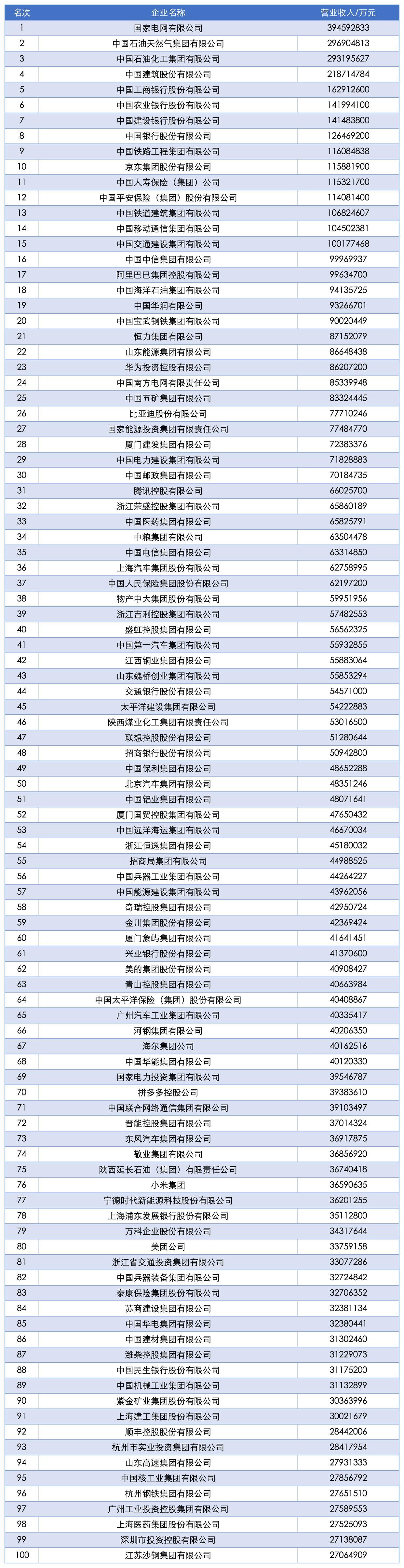 国家电网以 3.95 万亿营收排名第一,中国石油以 2.97 万亿营收排名第二,中国石化以 2.93 万亿营收排名第三,中国建筑、工商银行、农业银行、建设银行、中国银行、中国中铁、京东集团进入前十。共 15 家企业营业收入突破万亿元大关。